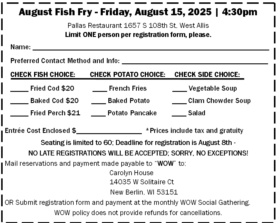 Come hungry! You’ll get your choice of Fried or Baked Cod ($20) or Freid Perch ($21). Entrees include choice of potato AND choice of soup or salad! Use the registration form below. Seating is limited to 60 people. Registration deadline is August 8th. NO LATE REGISTRATIONS WILL BE ACCEPTED, NO EXCEPTIONS! Contact event organizer with questions.