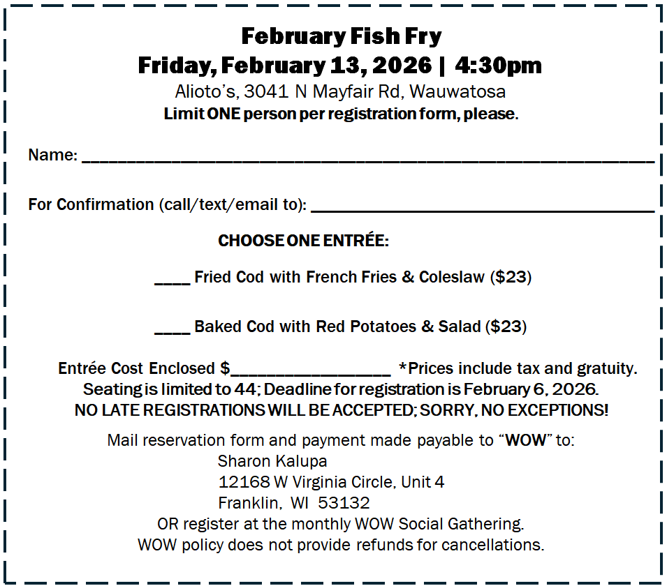 Entrée choices are Fried Cod with French Fries & Coleslaw ($23) or Baked Cod with Red Potatoes & Salad ($23). Both options come with rye bread, butter, lemon and tartar sauce. Prices includes tax & gratuity. Use Registration form on page 6. Seating is limited to 44; Deadline for registration is February 6, 2026. SORRY, NO LATE REGISTRATIONS WILL BE ACCEPTED, NO EXCEPTIONS! Contact Sharon Kalupa at 414-899-1265 or sharonk618@yahoo.com with questions.