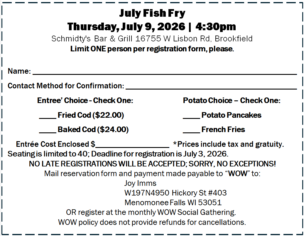 Choose from Fried Cod ($22) or Baked Cod ($24) and your choice of French Fries or Potato Pancakes. Make your selections on the registration form below and submit with payment at the next monthly WOW Social Gathering or send by mail (mailing address is located on the registration form). Deadline for registration is July 3rd. Seating is limited to 40. Got questions? – Contact Joy Imms (262-391-3606 or joyimms@gmail.com).