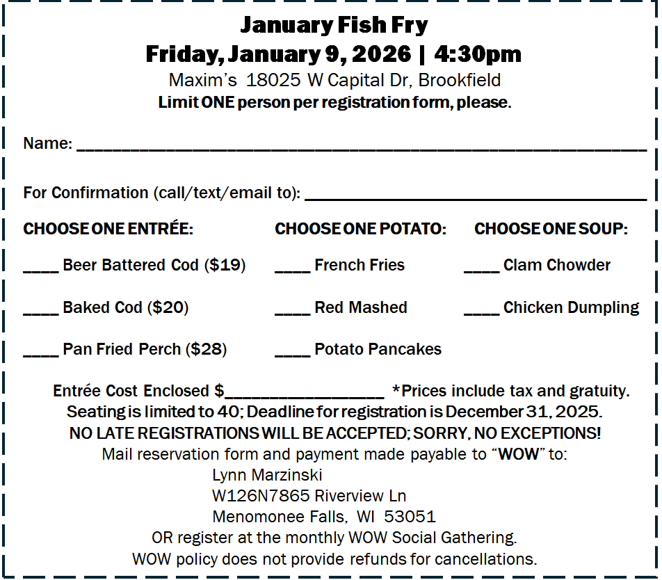 Entrée choices are Beer Battered Cod ($19), Baked Cod ($20) or Pan-Fried Perch ($28). All dinners include coleslaw, rye bread and tartar sauce and your choice of potato (French fries, Red Mashed Potatoes, or Potato Pancakes) and your choice of soup (Clam Chowder or Chicken Dumpling). Prices includes tax & gratuity. Use Registration form below. Seating is limited to 40; Deadline for registration is Jan 1st. SORRY, NO LATE REGISTRATIONS WILL BE ACCEPTED, NO EXCEPTIONS! Contact Lynn Marzinski at 816-616-6359 or lynnmarski@gmail.com with questions.