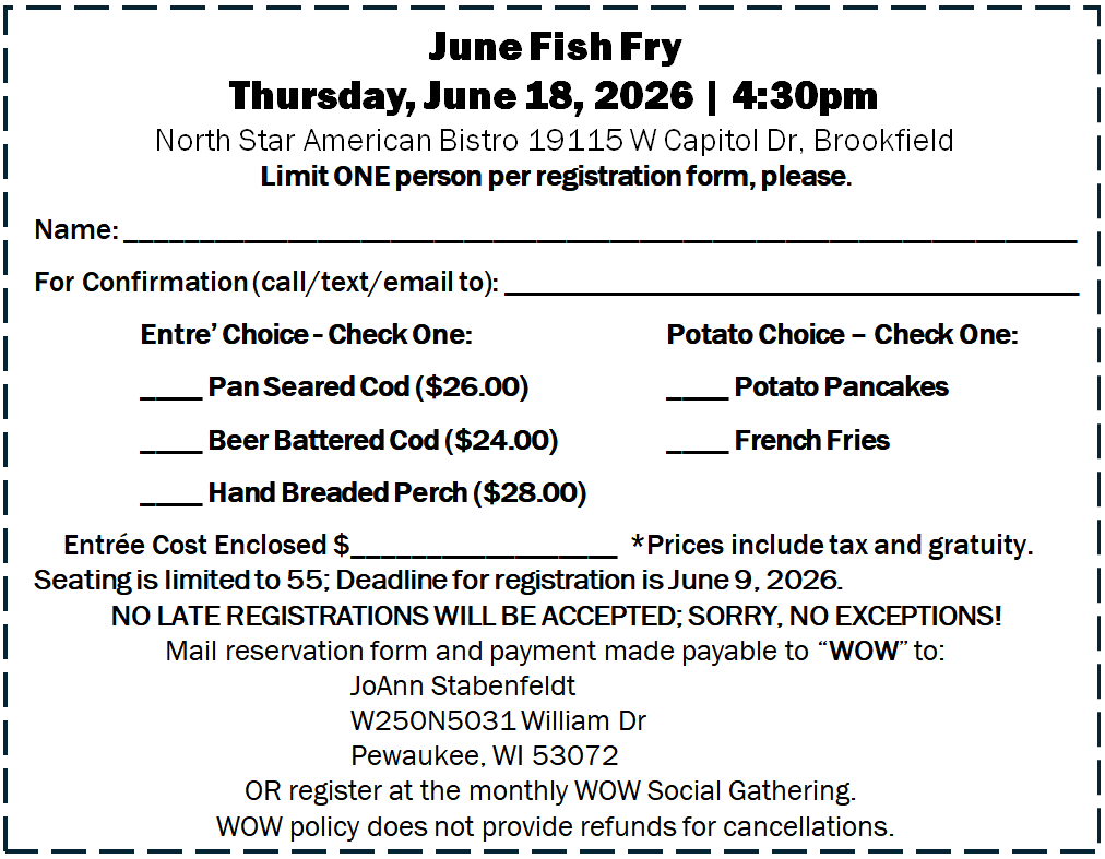 June’s Fish Fry will be at the North Star American Bistro! Your choice of Pan Seared Cod with Lemon Butter Sauce ($26), or Beer Battered Cod ($24), or Hand Breaded Perch ($28). Dinners include coleslaw and your choice of French fries or potato pancakes. Prices include tax & gratuity. Use Registration form below. Seating is limited to 55; Deadline for registration is June 9, 2026. STANDARD RULES APPLY – MUST BE REGISTERED PRIOR TO DEADLINE, NO ORDERING OFF THE MENU. Contact JoAnn Stabenfeldt at 414-412-3542 or joannstabenfeldt@yahoo.com with questions.