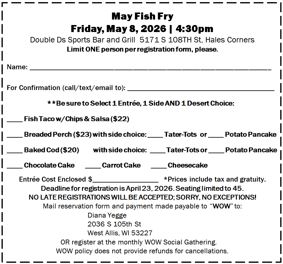 Your choice of Fish Tacos ($22.00), Breaded Perch ($23.00), or Baked Cod ($20.00). Fish Tacos come with Chips & Salsa, Perch and Cod entrees come with Coleslaw, Rye Bread and choice of Tator-Tots or Potato Pancakes. All meals include a choice of dessert cake: Chocolate, Carrot or Cheese. Make your selections on the registration form (link below) and submit with payment via mail or at the monthly WOW Social Gathering. Register by April 23rd. Seating is limited to 45. SORRY, NO LATE REGISTRATIONS WILL BE ACCEPTED, NO EXCEPTIONS! Contact Diana Yegge (951-452-9087 or 5dnyegge@gmail.com) with questions.
